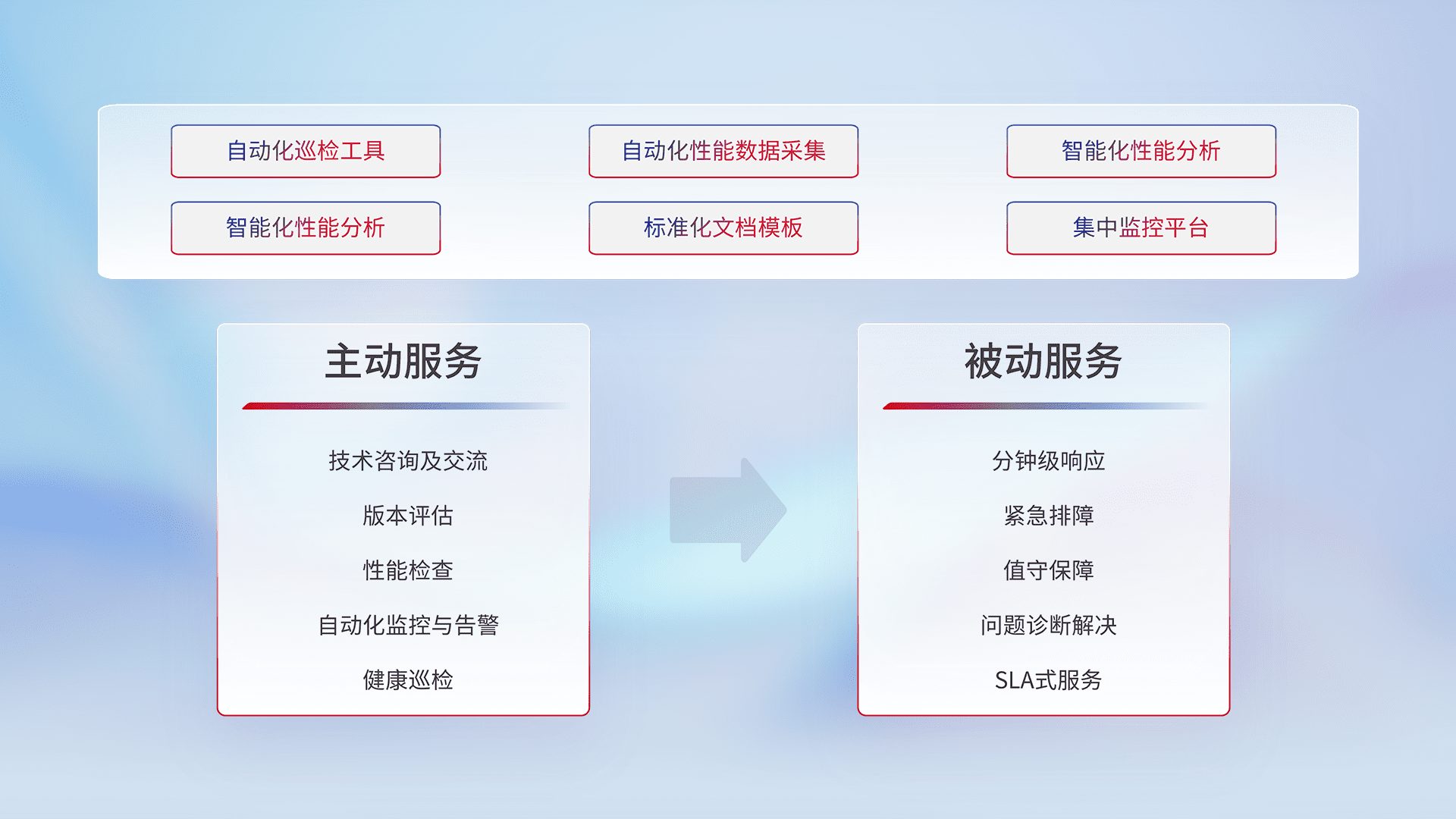 智能化工具和标准化文档,,保障服务质量,,提供主动服务(包含技术咨询、、、版本评估、、、、性能检查、、、自动化监控与告警、、健康巡检)和被动服务包含(分钟级响应、、、、紧急排障、、值守保障、、、问题诊断解决、、、SLA服务)。。。。